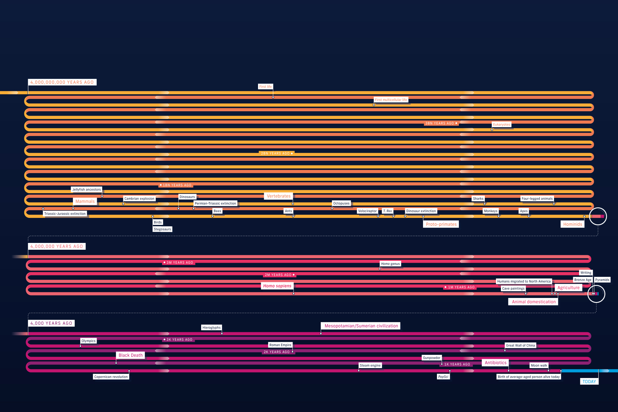 Humans have gotten a lot done in 300,000 years: We invented agriculture, developed writing systems, built cities, created the internet, and shrugged off gravity to land on the moon. These innovations make our past seem long—and stuffed with significance. But in the brief history of life, everything we’ve ever accomplished fits into a tiny sliver of time—just 0.008 percent of the entire continuum shown below. This is how the rise of the animal kingdom stretches out compared with our relatively insignificant existence.
