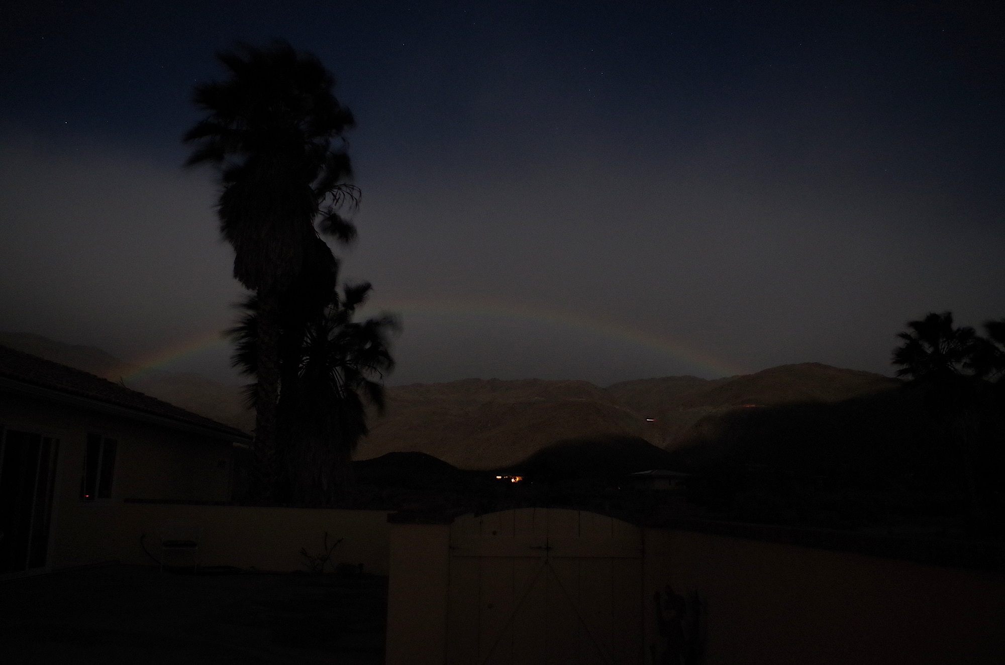 To witness a lunar rainbow, you need to be in a place untouched by light pollution and have all the right atmospheric conditions. In Rood’s case, his yard set the perfect stage. The state park belongs to the International Dark-Sky Network and follows strict protocols for curbing the glare on the ground at night. Combine that with a nearly full moon and west-to-east winds blowing unusually heavy rain clouds closer to the desert, and boom: a post-dinner rainbow.