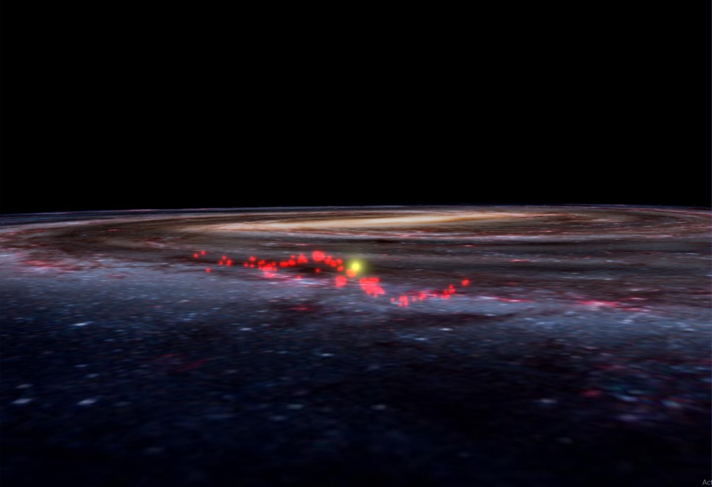 From above (you can play with an interactive 3D model here), that structure morphs into a wispy line stretching 9,000 light years—making it one of the largest known objects in the Milky Way. The team estimates that it harbors a combined mass in gas and stars of at least 3 million suns. From the side, however, it forms rolling hills and valleys that peak hundreds of light years above and below middle of the disk before tapering off. The wave sits just 500 light years from our solar system at its closest point, and based on the sun’s motion around the center of the galaxy, the researchers estimate that Earth passed through the wave just 13 million years ago—a few million years before the appearance of the earliest apes.