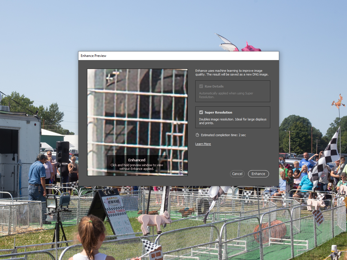 When you’re looking at the photos zoomed out, you can see a difference, particularly in areas with a lot of detail (typically referred to as “high frequency” areas). The lines in the fencing clearly become more defined and the whole thing appears generally sharper. These improvements likely stem from a related feature called Raw Details, which lives in the same dialog box as Super Resolution. Raw Details increase sharpness around the edges of objects to make them appear more crisp.