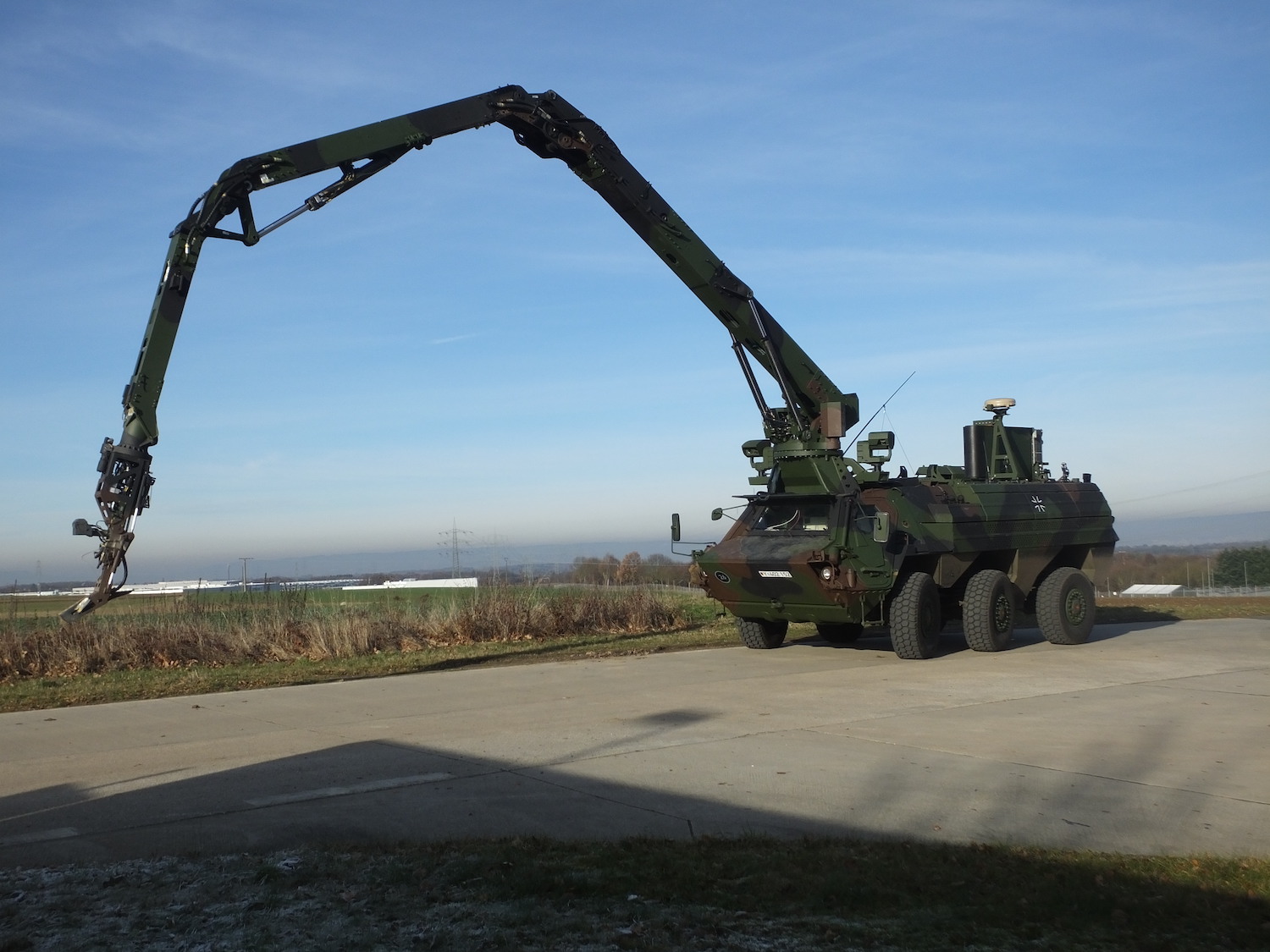 The long arm is carried atop the latest variant of a 30-year-old armored transport vehicle called the Fuchs 1A8 (“fuchs” is “fox,” in German). The 23-ton vehicle itself is well protected from mine and improvised explosive device (IED) blasts and can hit speeds as fast as 50 miles per hour.