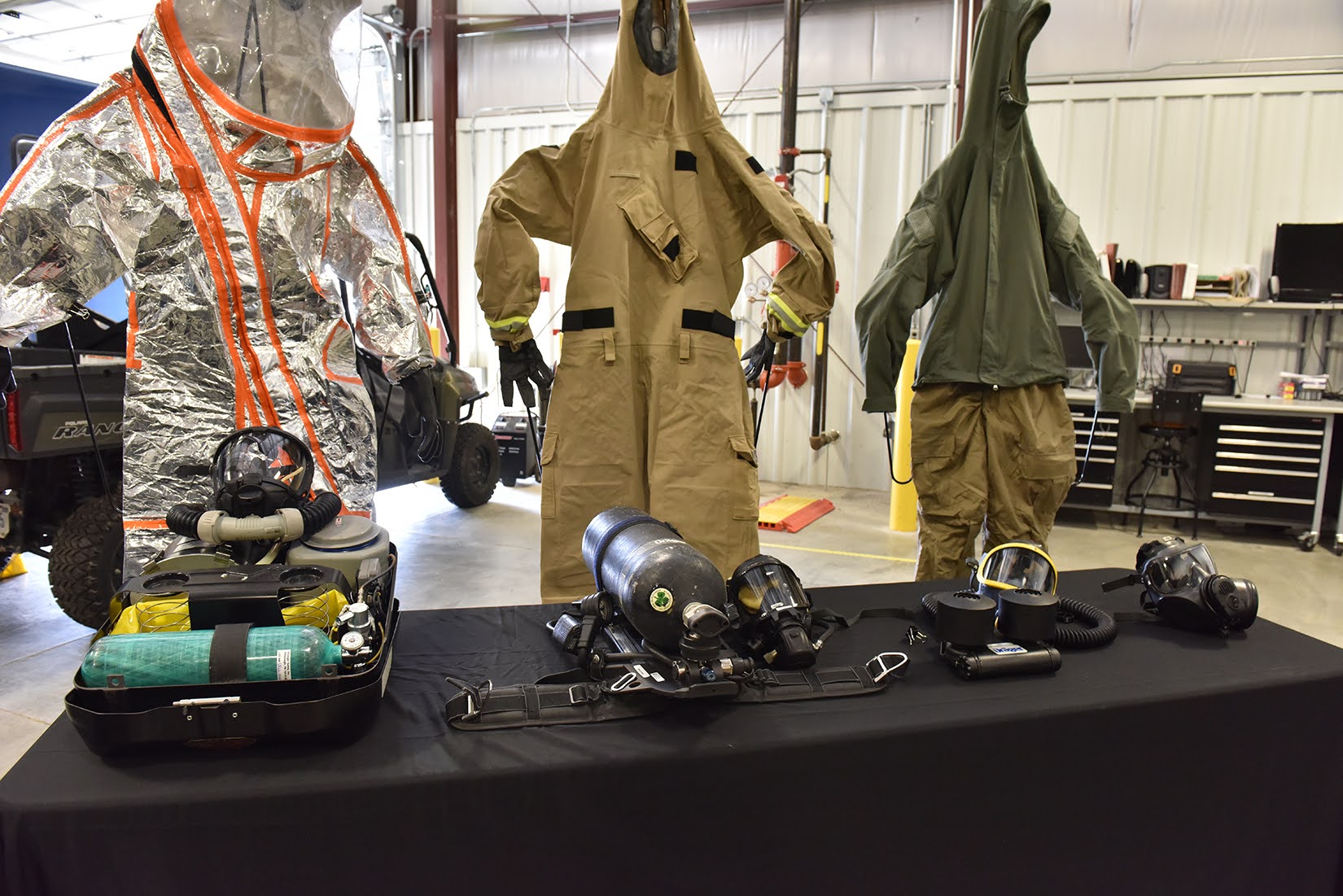 There’s a specific way of putting that gear on and taking it off, a process called donning and doffing. To put it on, First Sergeant Brendan Dunfee explains that initially you’d pull on an inner set of gloves, then a mask, then an overgarment, then the outer gloves. Doffing it happens in the opposite order: the first item you’d remove is the outer gloves, then the outer garments, then the mask, then inner gloves, and finally wash or sanitize your hands.