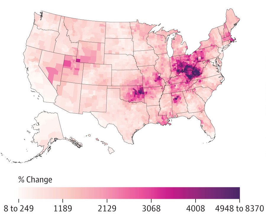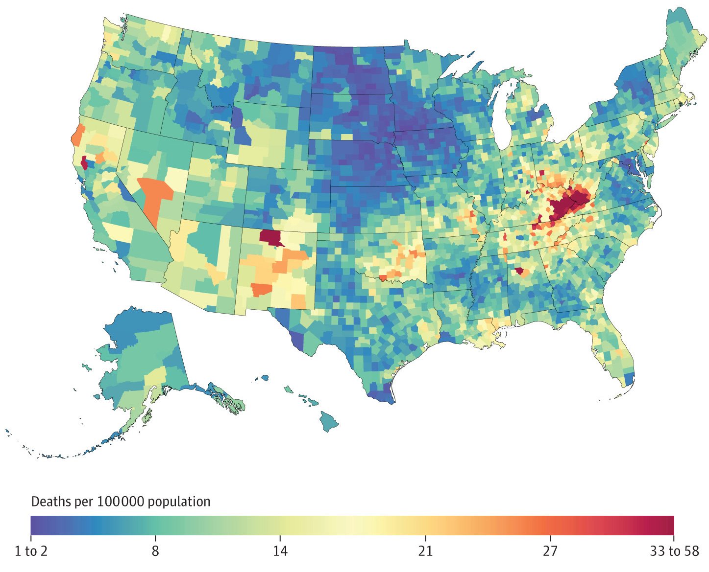 The question of why isn’t an easy one to answer. Health data on suicides, drug overdoses, and alcohol abuse are severely lacking. Most studies trying to look at county-level data are from the ’80s and ’90s, so even if policy makers want to figure out where the problem areas are, they don’t have access to sufficiently detailed information. That’s exactly what a new study in the Journal of the American Medical Association aims to fix.