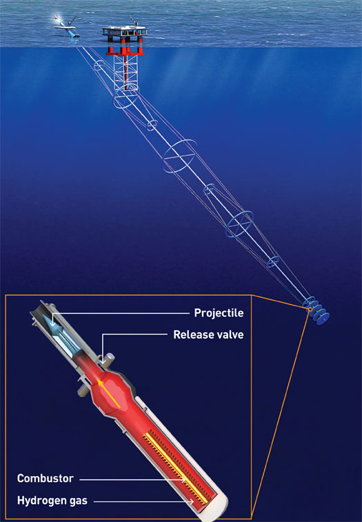 After speeding down the 3,300-foot-long barrel, the projectile shoots out of the gun at 13,000 mph. An iris at the end of the gun closes, capturing the hydrogen gas to use again.