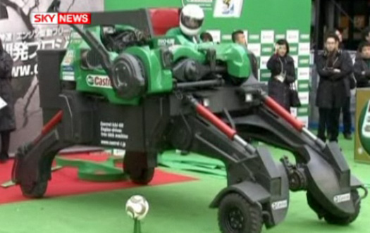 Developed by artist Kogoro Kurata, the machine runs on an automobile engine with differential gears that stores up energy in a flywheel that is then released to the steel and carbonfiber leg. The two-ton machine itself rolls around on electric engines rather than the kicking engine.