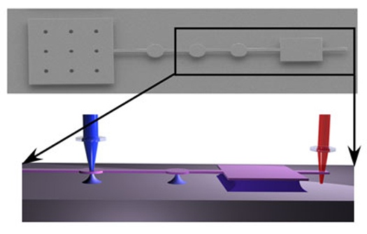 The nanomachine takes the general shape of a diving board, a form called a cantilever. At one end of the cantilever sits a nanoelectromechanical oscillator; at the other end, a laser. When the laser strikes the oscillator, the whole cantilever vibrates at a specific frequency. If a particle lands on the cantilever, the frequency changes in a predictable way, revealing the identity of the particle.