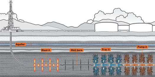 Once a well is drilled and a pipe is secured half a mile or more into the shale, well workers send a “perf” gun down into the pipe. The gun shoots small explosives that perforate the well casing and the rock along the well bore. When the well is complete, the natural gas will flow through these channels.