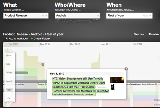 In other words, it’s less a matter of Recorded Future wagering an educated guess about a future event and more like an aggregation of predictions that have already been made. That aggregate collated prediction about the future is influenced by all the factors listed above and gives, say, a stock analyst a reasonable measure of when an event is likely to happen.