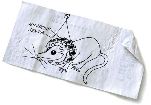 Commercial PET scanners, even for small animals, are several feet tall and weigh hundreds of pounds. We got ours down to under eight ounces; the outer diameter is a little over three inches. We call it RatCAP, for Rat Conscious Animal PET. We were able to make it so small using two new components: a thinner photo sensor called an avalanche photodiode, and a custom microchip that reads the signal from the sensor. The scanner has a single data line, so the animal can move pretty freely. The device hangs from the ceiling on a long, stretched spring, which takes the scanner’s weight off the rat.