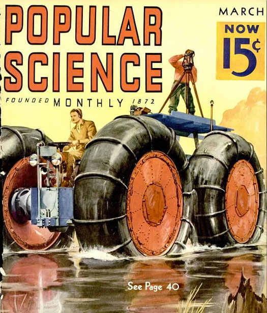 As a bonus, we threw in a couple of peculiar seaplanes from the 1930s, because who can resist an illustration titled “Air Conqueror of Tomorrow”? As goofy as some of these concepts look in retrospect (just wait until you see the amphibious bicycle), they’re not far removed from the amphibians in operation today. For instance, one French inventor designed an underwater tour bus similar to the ones used in Duck Tours, except that his could actually dip underwater.