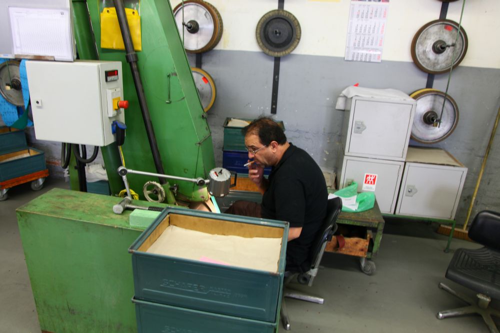 The knife passes into the hands of another series of robots, which use grinding wheels to narrow down the thickish blank into the tapered contour of a blade. Only roughly, though — the fine grinding and sharpening, as well as putting on the handles, is left to the factory’s humans, who wear puffy gray overalls and exude the confidence that comes with being extremely good at your job, and quite possibly coming from a line of knifemakers generations old. Wooden handles are glued onto the tang of the knife and then riveted in place; plastic handles are simply melted on by heating the tang and inserting it in a ready handle. The edges of the handles are smoothed by robots.