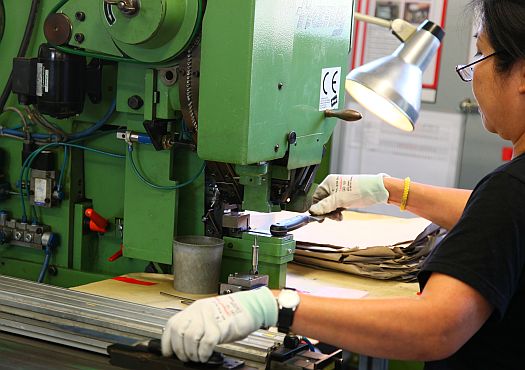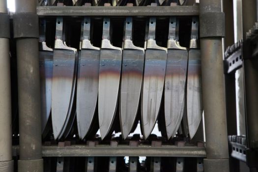 The raw material comes into the factory on huge spools of sheet steel, each sheet the thickness of a knife. The steel is cut into individual blanks, destined to become individual knives. About three weeks elapse between when a blank comes off the spool and when it emerges, a finished knife, at the other end.