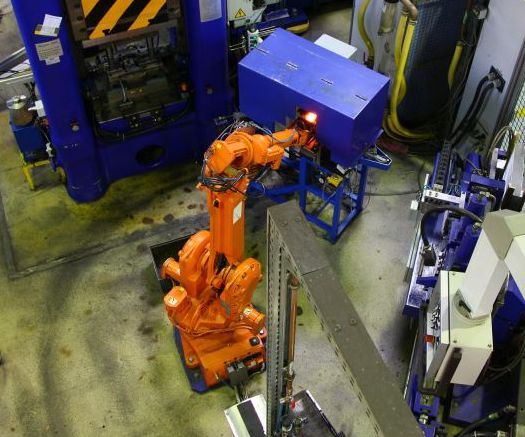 In the classic design, the knife has a thickening where the blade meets the handle (aka the bolster). This is formed first, by heating the middle of the blank, and then pressing the metal’s two ends together so the molten middle bulges and widens, in a process that my contact specifies is called upset forging. Next, a drop forge shapes the bolster, before the blank is quickly cropped into the rough shape of the knife it’s going to be.
