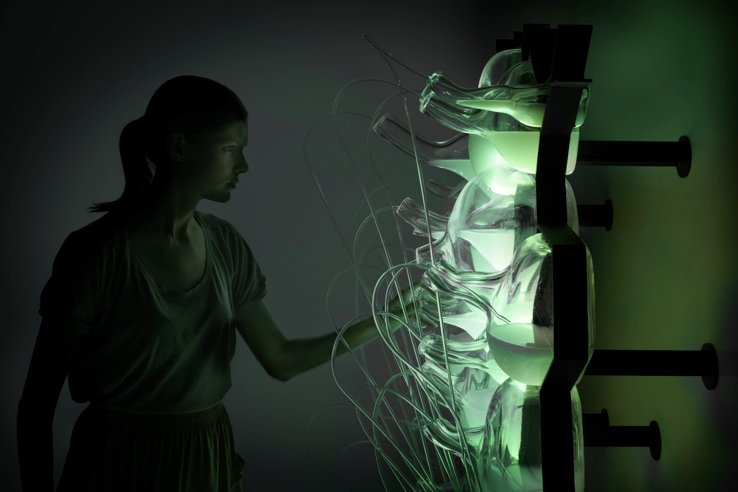 Individual bioluminescent bacteria would be inserted into their own interesting-looking blown glass cells, forming a living lamp. Silicon tubes would connect the bacteria to the life-sustaining sludge at the lamp’s base.