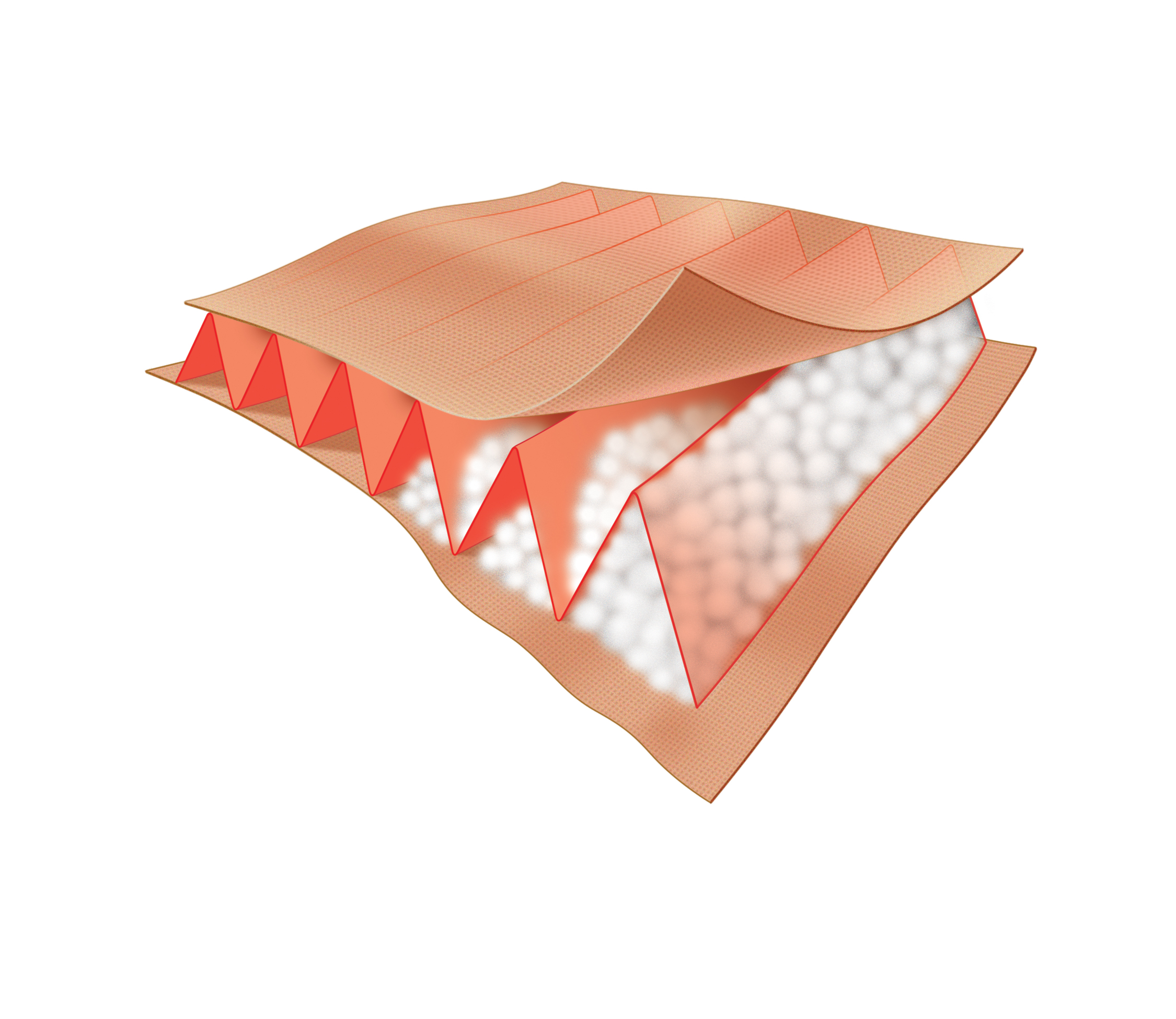 ThermoBall, created by noted outdoors/college campuses company North Face, is a synthetic insulation that closely mimics down. Unlike traditional continuous-filament synthetic insulations, which are laid out in flat sheets comprised of thousands of long filaments, ThermoBall is made from short strands of polyester that have been spun and frayed into millions of fuzzy miniature cotton-ball-like balls, 0.15-0.2 inches in diameter. They float inside hundreds of tiny pockets, or baffles (seen above), sewn into a jacket. They are designed to cluster like feathers, maintaining air pockets (which are key for retaining warmth) rather than clumping together into a solid mass.
