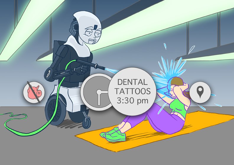 As Octavia the hosebot helps her keep her cool, our athlete gets in a few last crunches before her appointment; all seen through smartglasses. That’s this week in the future.