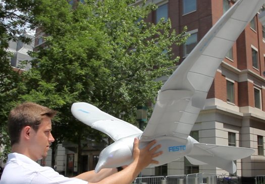 Festo Smartbird: The engineers at Festo’s Bionic Leaning Network are well-known for their interest in artificially replicating animals (and weird things that propel themselves by flipping inside out), but they’ve truly outdone themselves with the Smartbird. Inspired by herring gulls, the Smartbird can take off, fly and land by itself, mimicking the behavior of real birds to an uncanny degree. Due to the breezy day at Innovation Square, the bird was launched by hand and controlled via a ZigBee radio, though the result was just as stunning. For all its sophisticated machinery and two-meter wingspan, the Smartbird weighs less than a pound, limiting the amount of flapping it needs to do to stay aloft. Festo has developed many other artificial animals, including flying penguins, elephant trunks and jellyfish (next). Check out video of the bird: