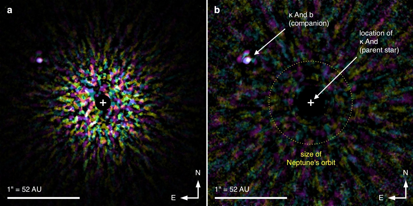 Kappa Andromedae is part of what’s known as the Columba stellar moving group, and at just 30 million years old it is relatively young (our Sun is estimated to be more like five billion hears old). That’s significant if only for the mode of discovery–young stars are good targets for directly imaging exoplanets because their planets (also young) tend to retain more heat leftover from the formation process and thus reveal themselves more readily via infrared emissions. That’s how the researchers were able to zero in on Kappa And b, the super-Jupiter orbiting Kappa Andromedae at a distance about 1.8 times Neptune’s distance from the Sun, over the glare of its host star.