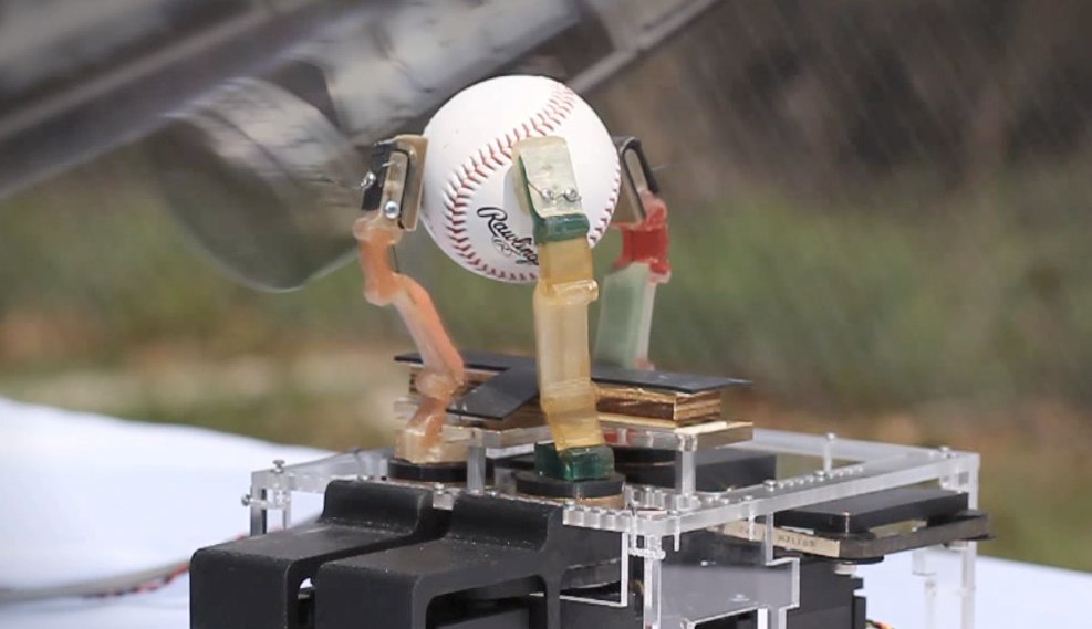The sporting video above is a demonstration of something iRobot and others have been working on for a long time–robotic actuators that are both useful but also safe to use in human environments. The robots that will someday populate our homes and workplaces need to be able to manipulate the physical world around them but for obvious reasons we don’t want them to operate like heavy machinery, with powerful metal actuators and bone-crushing force. These soft robotic digits are one possible solution to the problem.