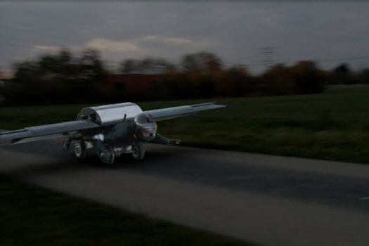 The project has gone through three prototype wings. Right now the model is made of plywood, but the next step will involve fiberglass construction and even more powerful engines. Without a pilot, it currently weighs 25 kilograms, a little more than 50 pounds. It’s controlled by a throttle and an 8-inch display strapped to the pilot’s wrist, which connects to a computer within the central wing body.