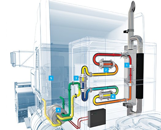 1) 660°F semitruck exhaust heats a refrigerant mixture [red] flowing through an exchanger. The refrigerant’s solvent boils from its solute, pressurizing the HYPER system.