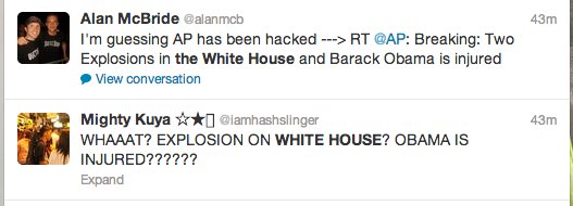 These two stories show both sides of the crowd-sourced hive mind with which we analyze information on Twitter. On the one hand, the masses came to the right conclusion very quickly in the case of the AP hack; if you looked at literally a single tweet besides the one from @AP, even if you weren’t sure what to think, you’d immediately have to consider the possibility that the tweet was not genuine. It caused no damage, no panic. Nobody was hurt, really; it’s hard to even blame the Associated Press. It could happen to anyone, and the AP was conscientious in conveying what had happened (and getting their Twitter feed temporarily shut down) within minutes. The power of the crowd directed people to the truth.
