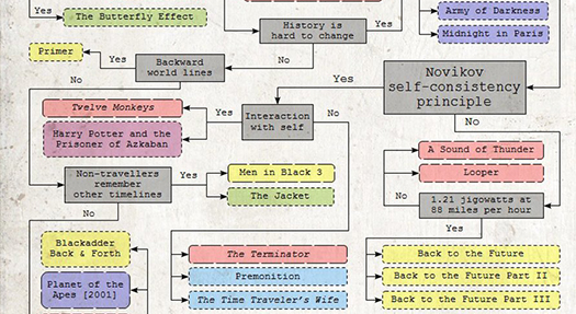 This infographic by Mr. Dalliard documents the nature, logic, and scale of time travel in film. Most of the terms are straightforward, and then there’s the “Novikov self-consistency principle.” Developed by a Russian physicist between 1975 and 1990, it asserts