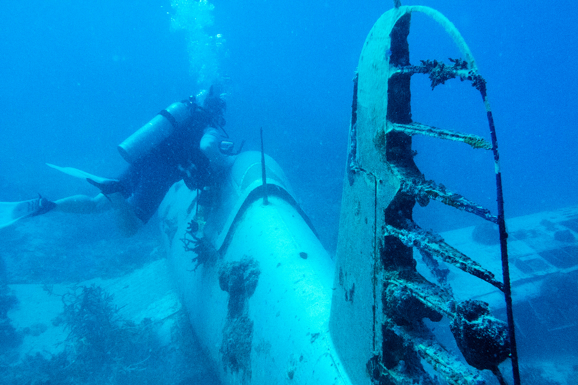 I strap on a scuba tank and jump into the water with Scannon, who wants to see for himself. We follow a rope line, pinching our noses on the way down to equalize pressure, until we arrive at the fuselage. It lays on a bed of thick sediment that our fins kick up into dusty clouds. Long, gangly strands of black coral grow up and through the corroded metal. The front motor and propellers have broken away from the body of the plane, so that it now resembles a chewed-off cigar or the burnt end of a firecracker. Scannon waves me over to the cockpit and places my hand on the gun mount. It held a 7.7mm machine gun, Scannon later explains to me, developed by the Japanese navy.