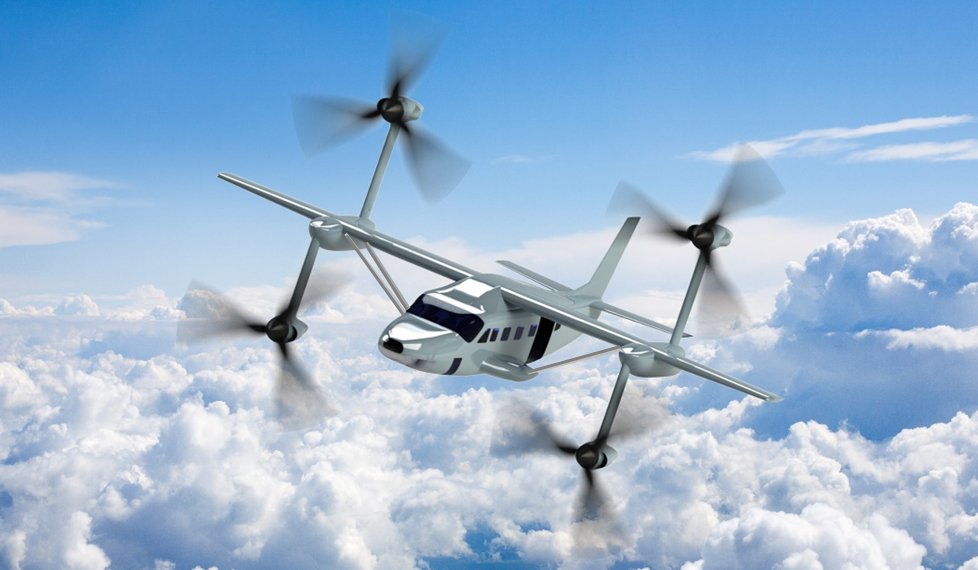 For vertical takeoff and landing, the Barracuda uses four rotors, mounted on pylons that extend from the wings. This lets it act like a big quadcopter. Once airborne, the front pylons swing down and the rear pylons swing upwards, pointing all four rotors forward as propellers. It is a design somewhat reminiscent of the V-22 Osprey presently in military service, though as planned the Barracuda’s four smaller engines and pylons should allow for more redundancy and smoother flight.