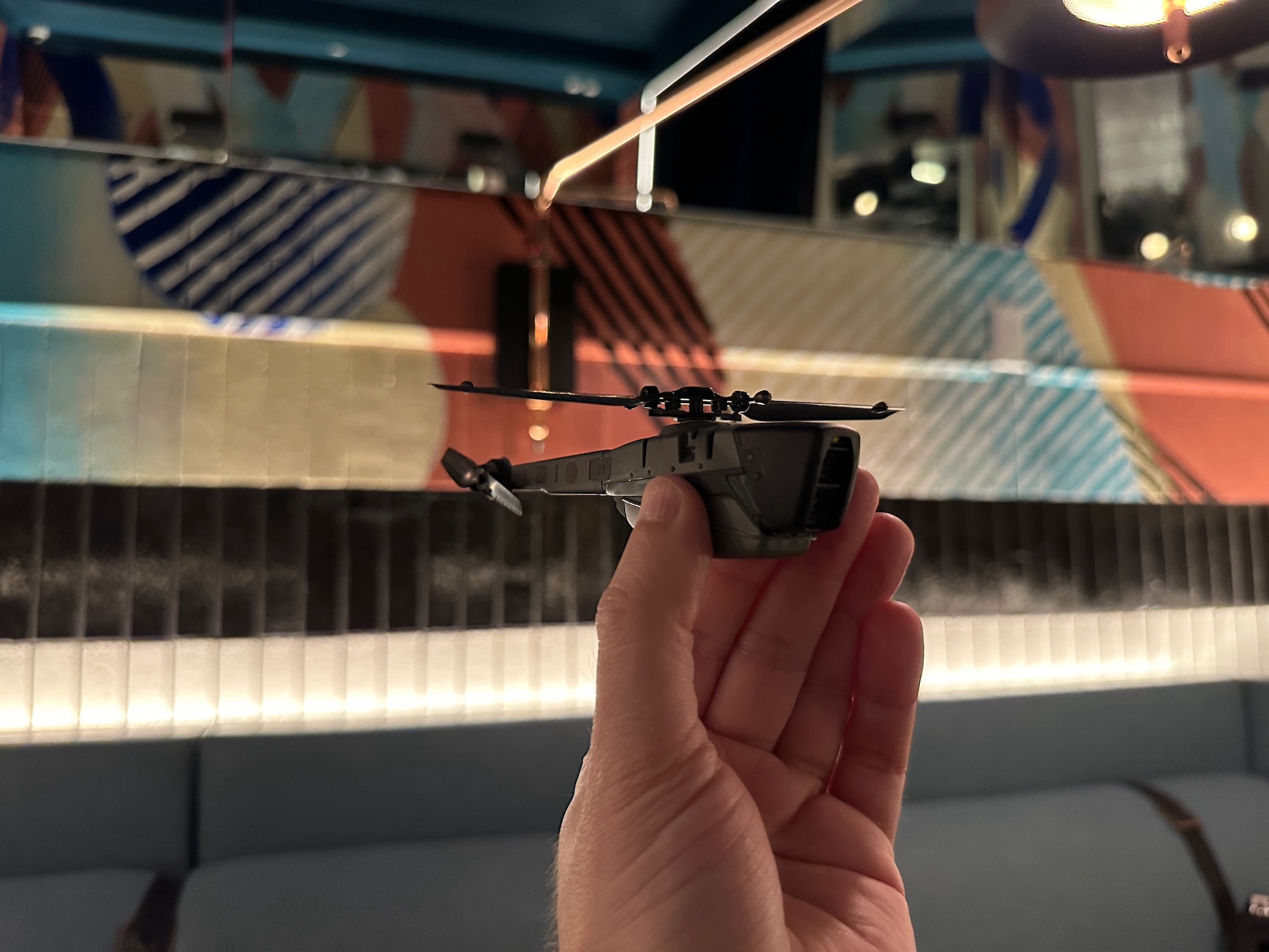 I hold the helicopter in my left hand, and after I put the system in “indoor mode,” Laskovich tells me, “you’re ready to fly.”