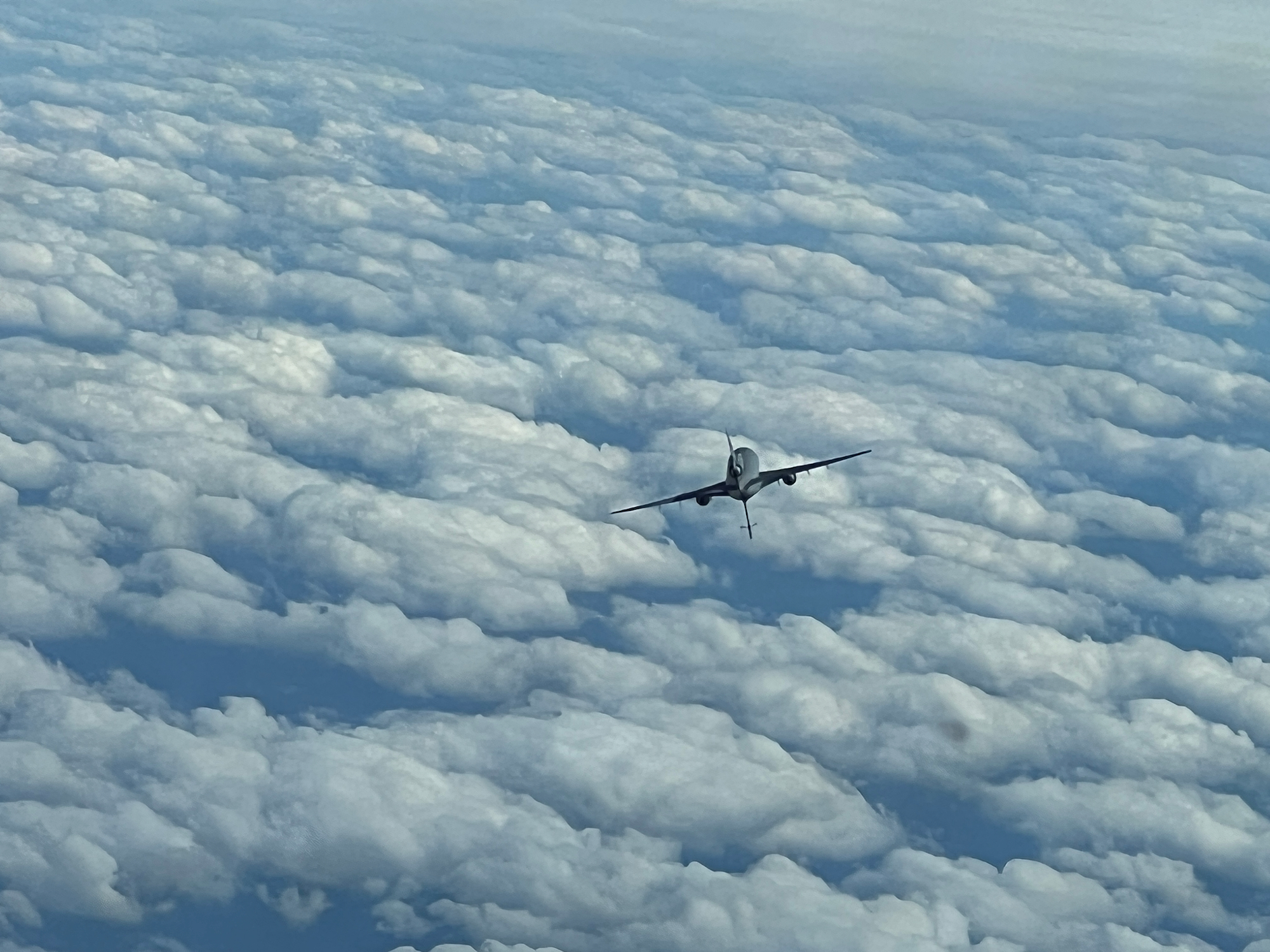 We finish giving the fighter jets the fuel they need, then practice with another KC-10 tanker (the vessels are also capable of receiving fuel in flight). We fly up close behind the other large metal bird, visible right there through the cockpit windows. Its colorful boom hangs below. We go through the motions, though no liquid changes hands.