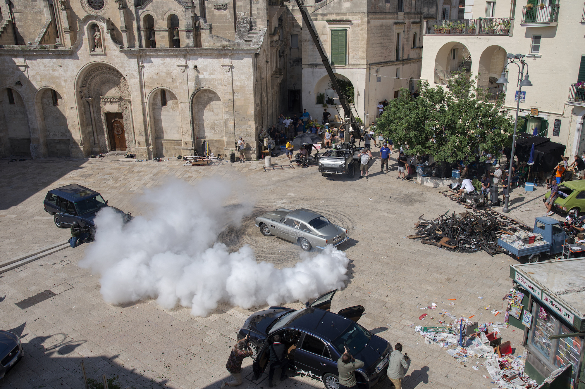 In another moment towards the beginning of the film, Bond is behind the wheel of an Aston Martin DB5, and there’s a scene in which the car spins in circles, spraying bullets from guns protruding from the front of it. “Daniel [Craig] actually did that donut in the square,” Corbould says, “where it was spinning around and firing the guns at the walls.”