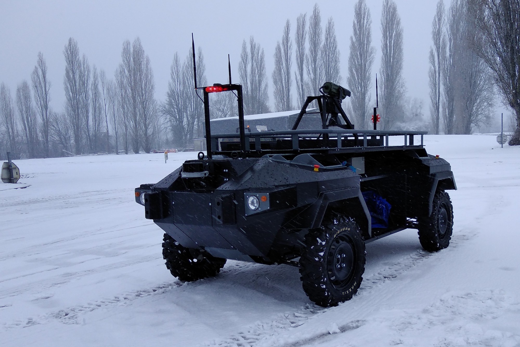 The Robbox vehicle looks like a 1,500 lb 4×4 wheeled jeep without a roof. It’s about 5 ft wide, 11 ft long, and can carry 1,100 lbs of mission modules. These modules can be integrated on the roughly 8 ft by 4 ft platform and in the approximately 5 ft x 4 ft x 2 ft space underneath the platform between the wheels. Its task is to carry cargo in different forms. The flat platform can also be equipped with a stretcher to rapidly evacuate a wounded soldier, making it similar in concept to this robot the US Marines have been testing.