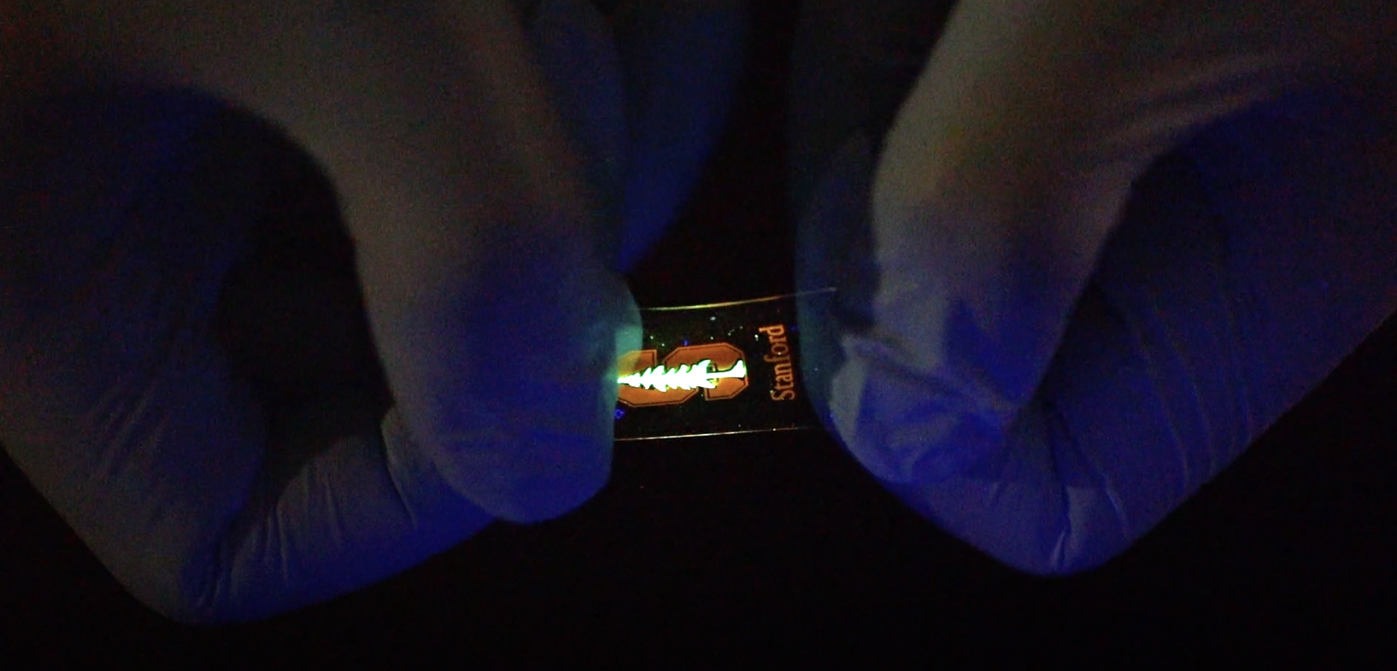 Bao and her team wanted to make all the components of this screen elastic. “We developed a stretchable conducting polymer that can be used for the two electrodes. But since one electrode needs to allow holes to go in, and the other electrode needs to allow electrons to go in, we also need to facilitate transport through the layers,” Bao says. “The light emitting material here needs to be stretchable but it also needs to give off a lot of light. We want a bright display.”