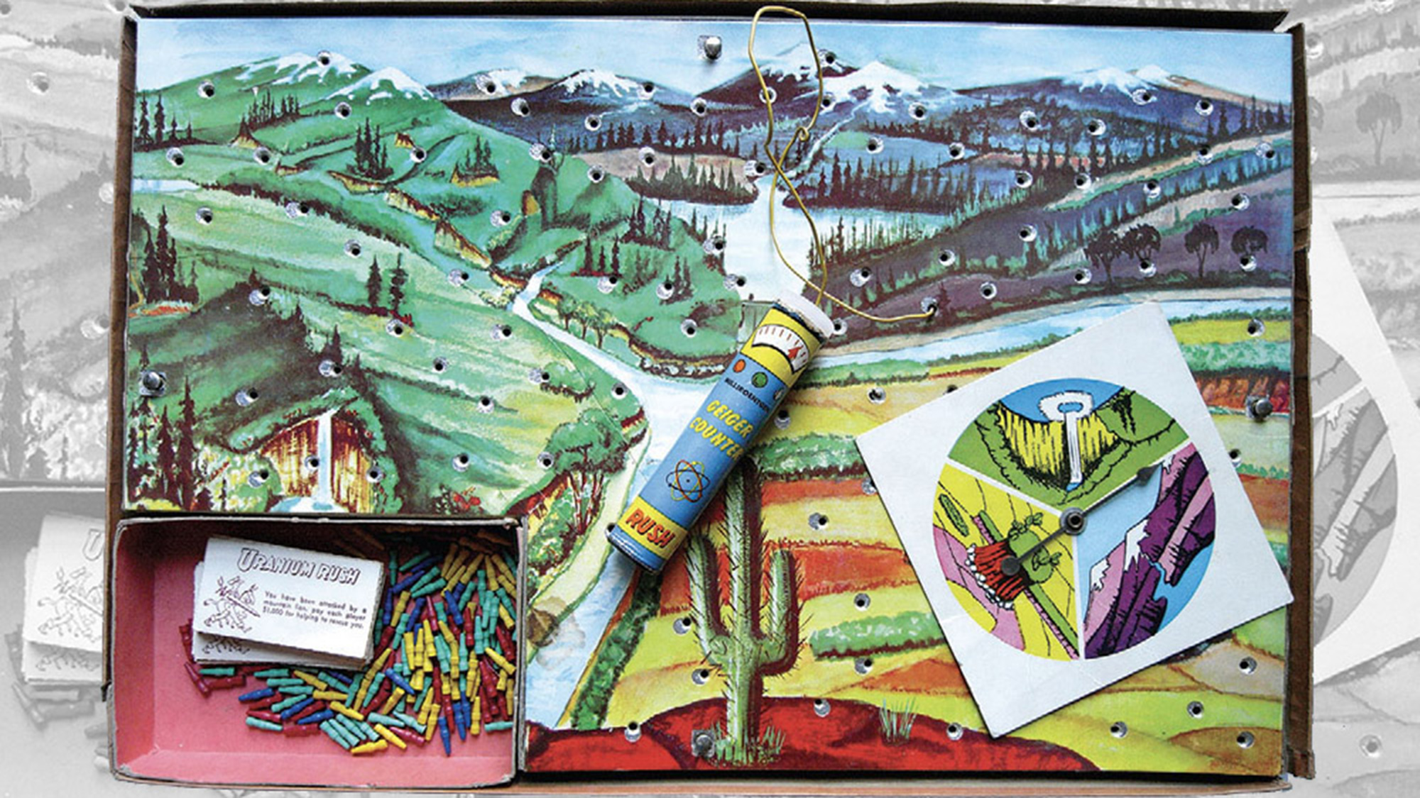 Unlike some Geiger counters included in science kits from the era, the toy version in Uranium Rush does not detect radiation but instead features a light and buzzer that activate when a wire is touched to the correct mines. Wielding this oversize tool, players discover the landscape to be a circuit board, crackling with potential energy and exciting, though elusive, knowledge — the electric light itself having long been used to represent a new idea. Because the pattern of lucky strikes is determined by which of four metal posts the Geiger counter rests on, a player can memorize which claims to stake; the game board takes on the same disposable quality the U.S. government seemed to ascribe to western land itself.