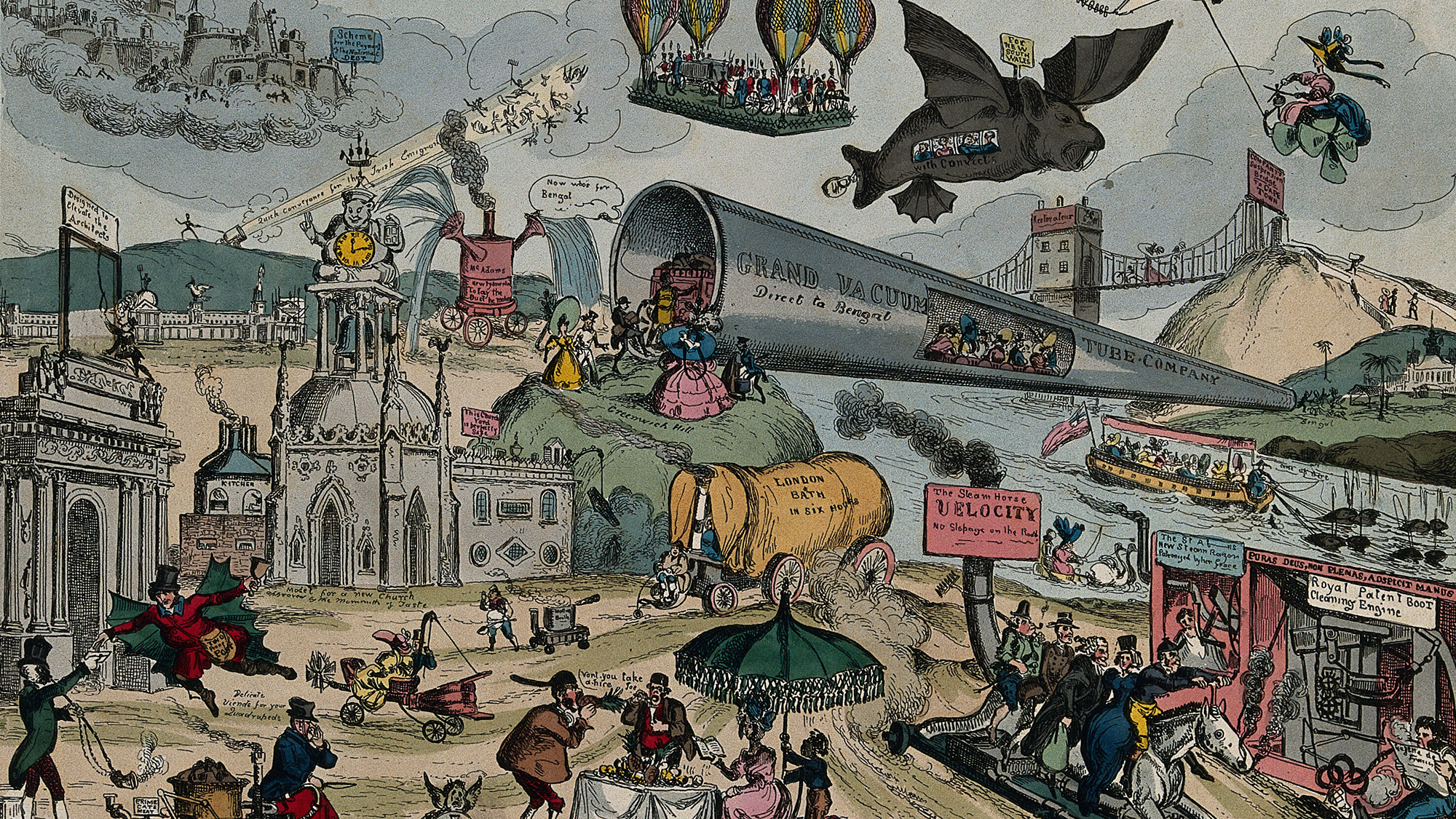 In 1829 Thomas McLean in London published Heath’s colored etching “March of Intellect. Lord how this world improves as we grow older.” The busy image is crowded with such would-be futuristic contraptions as a suspension bridge from Cape Town to Bengal, a four-wheeled steam-powered horse called VELOCITY, a gun-carrying platform that was lifted by four balloons, and a large winged flying fish crammed with convicts being transported from England to Australia. But the etching’s center of interest is a large seamless metallic tube that is conveying passengers from Greenwich Hill (in East London) directly to Bengal, thanks to the innovative acumen of the Grand Vacuum Tube Company.