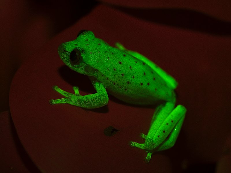 No one has yet studied the polka-dot tree frog’s visual system in depth, so it’s unclear exactly what they’re picking up from each other’s fluorescence or if they are at all. We just don’t know whether these frogs can pick up the low levels of light coming from each other’s skin or not. In general, though, green tends to be part of the spectrum that amphibian eyes are most sensitive to. If their eyes can pick up that faint glow, then fluorescing green could be very useful at twilight when light is low—they’re basically converting what little UV light is left into a form of light that other members of their species can see.