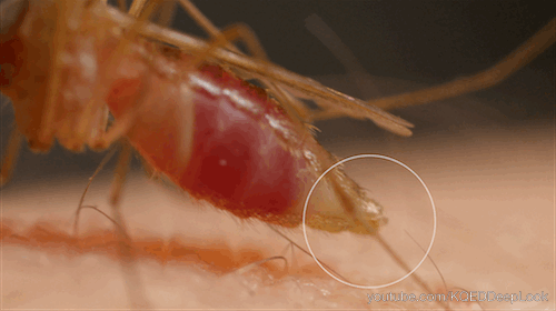 A new video from KQED describes the process by which an adult female mosquito sucks your blood, from when she draws back the sheath on the six needle-like proboscises and saws into the skin, holding open the wound while she drools into it, sucking up our blood in the process. (Female mosquitoes are the bloodsuckers of their kind — males feed on fruit nectar.)