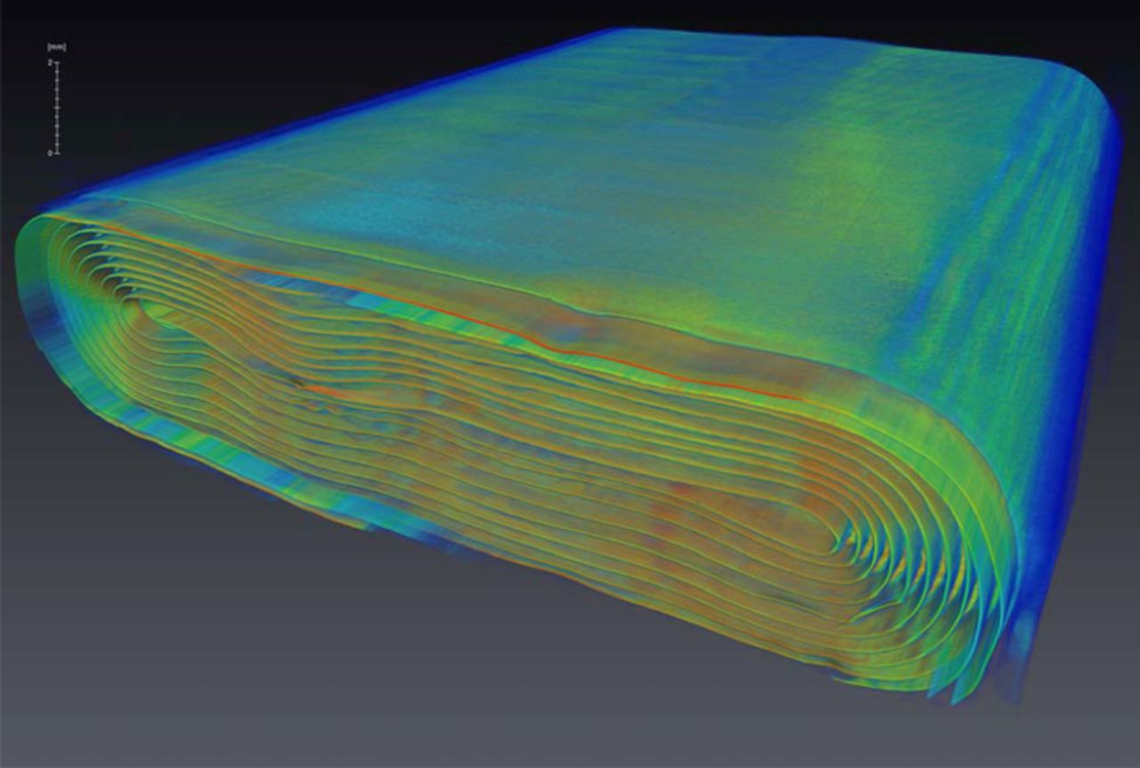 Inside the battery is an electrode that spirals out from a central point like a jellyroll. The x-ray scan revealed that the bubbles produced during overheating warped and dented this electrode.
