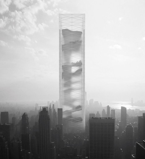 Visitors ascend through the ecosystems on a series of gradual ramps. The skyscraper’s design lacks the vertical beams and horizontal concrete slabs typically found inside a building, so these gradients also provide an element of structural support.
