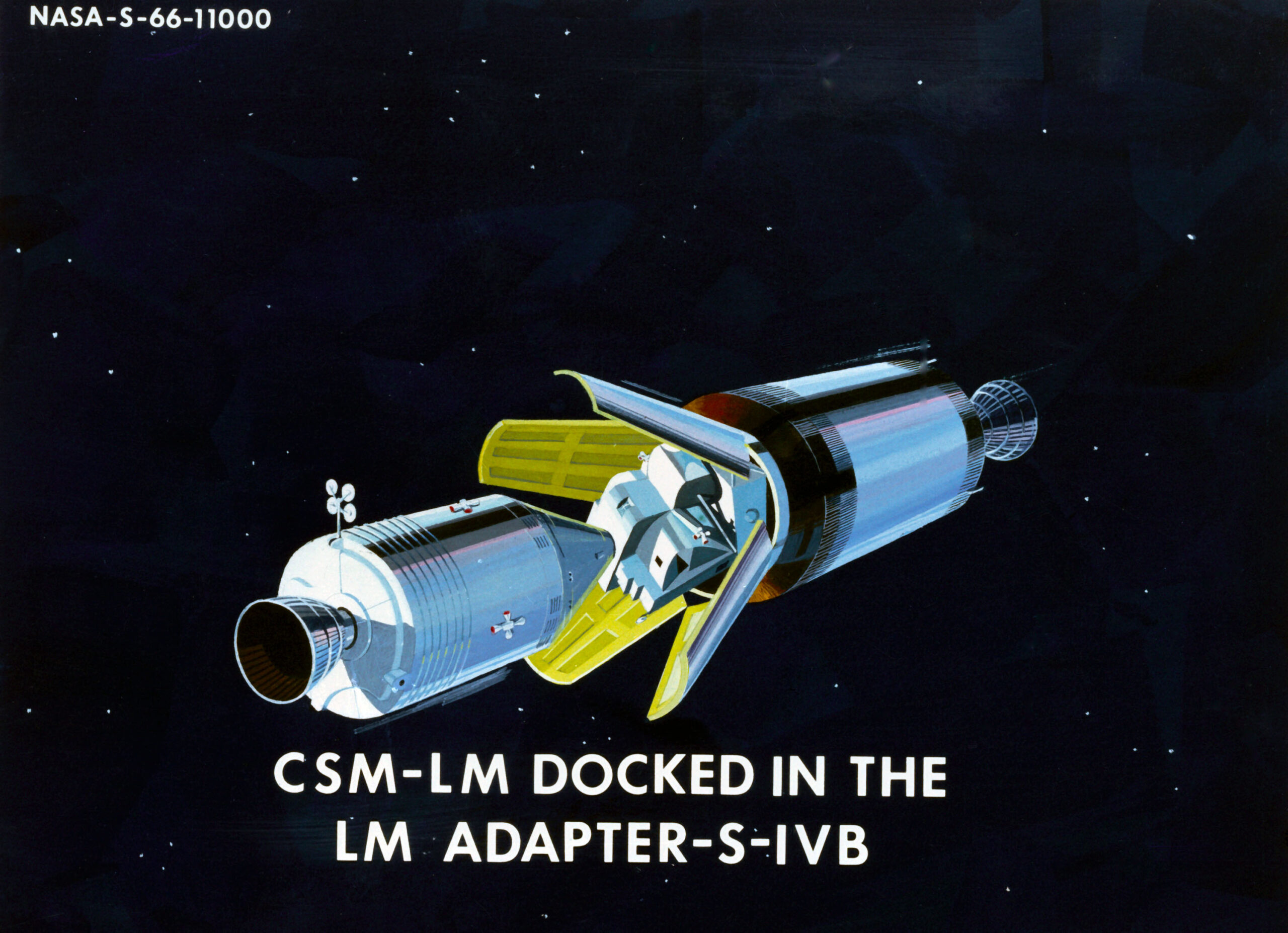 Once the crew was on their way to the Moon, it was time to get the LM and CSM docked, a manoeuvre properly called transposition and docking. First, the command-service module separated from the S-IVB stage using its reaction control system thruster; firing the service module’s main engine so close to the LM would probably have burned the lunar module pretty badly. From there, the command module pilot had the job of turning the spacecraft around and closing the distance between the two vehicles, taking care to line up the CM’s docking probe with the LM’s drogue.