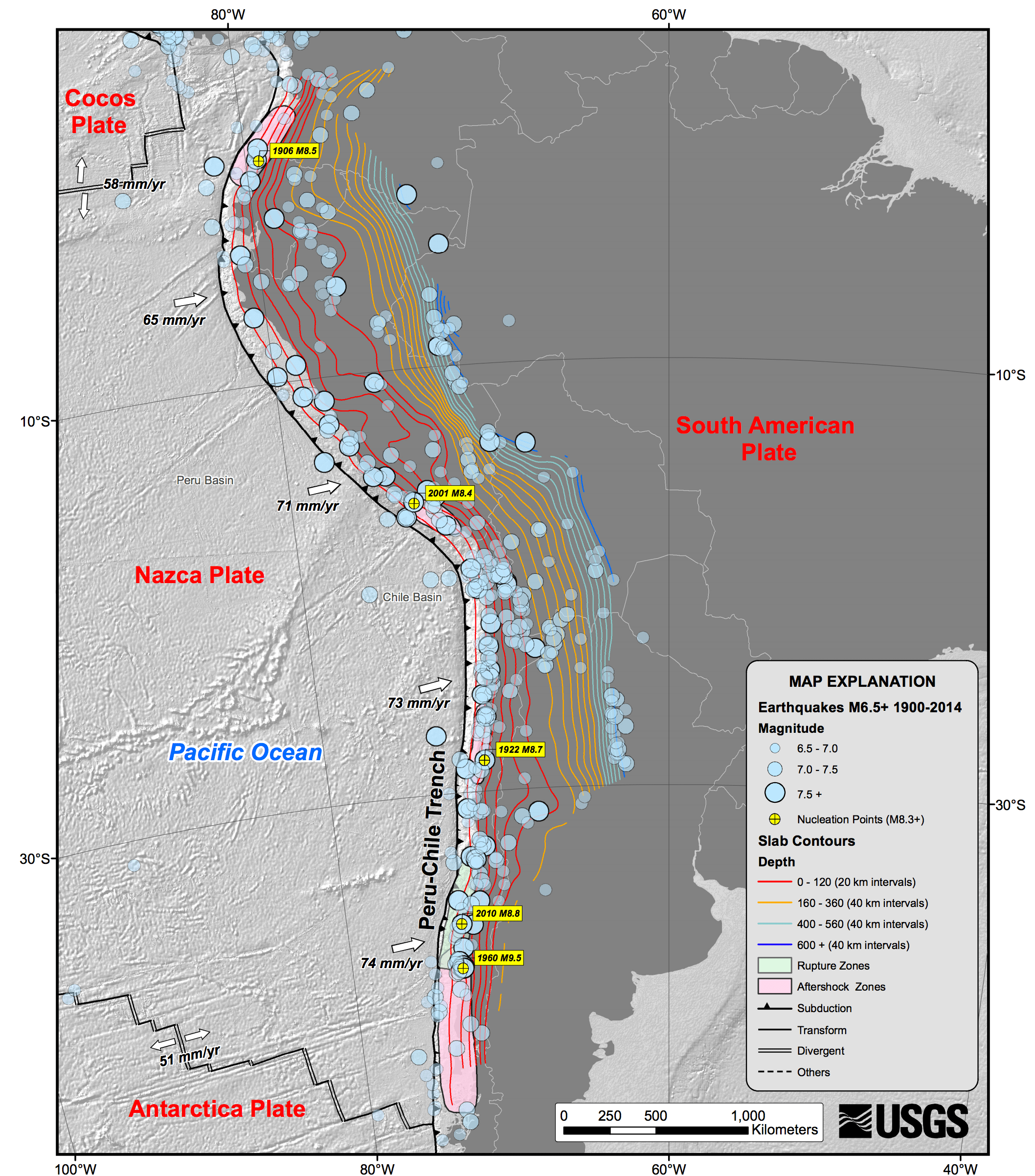 Chile is located at the intersection of two tectonic plates, areas of the Earth’s surface that underlay all the continents and oceans on the planet. Chile is located on the South American plate, where a small plate called the Nazca plate, located under the Pacific ocean, is sliding under the South American plate. That motion is pushing up the Andes mountains, and for the most part moves under the South American plate slowly, moving around 3 inches every year. But occasionally, large areas of the Nazca plate slip, moving quickly and dramatically, and causing huge earthquakes. The largest earthquake ever recorded, a magnitude 9.5 happened in Chile in 1960, and more recently a huge 8.8 magnitude earthquake occurred in 2010, killing over 500 people when a tsunami caused by the Earth’s shaking slammed into shore.