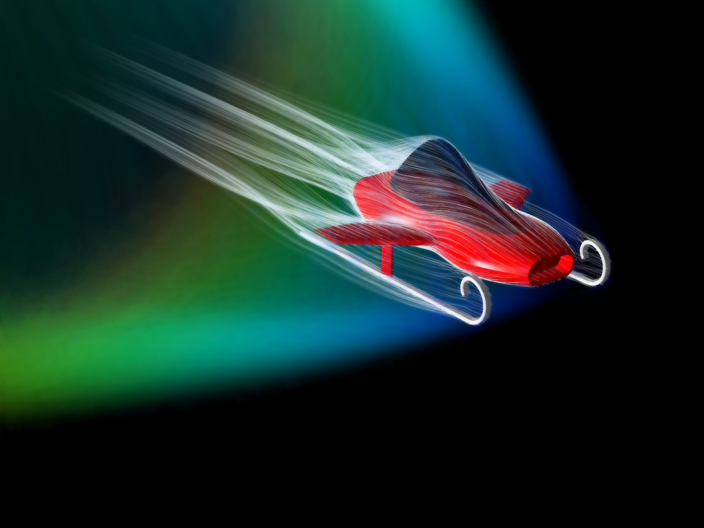 In the simulation models, the lines visualize the path of the airflow around the sleigh. The air molecules flow around the shape, making their way to a region behind the object. There, the airflow actually gets sucked into the back of the sleigh and recirculates, causing a region of low pressure. “The object wants to go towards the region of low pressure, so basically the region wants to pull the sleigh back,” Eggenspieler explains.