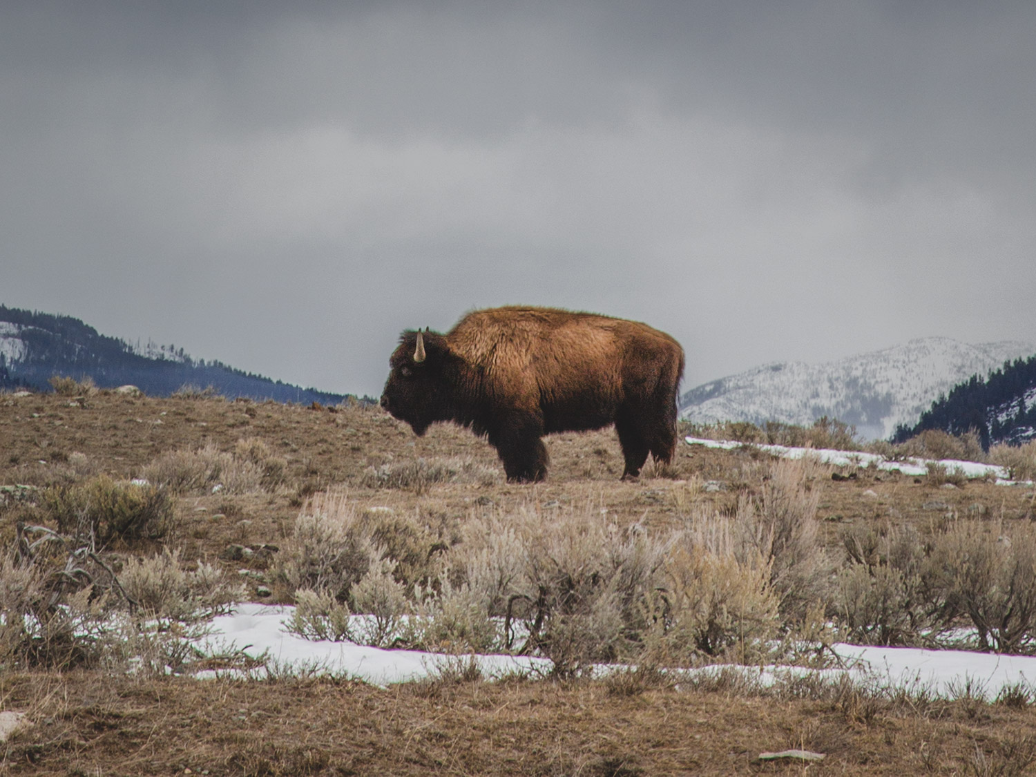 In the late winter sun, Yellowstone National Park‘s blanket of snow is blindingly white. The great shaggy beasts—bison, in their thick, burnished winter coats—thrive in the glare. A few yards from where I stand on the road, a small group is gathered, sweeping their upturned horns from side to side, grunting softly as they plow away the snow to graze. I’m transfixed, so it takes a minute to notice the hundred or so more scattered in the valley ahead of me. Across the steep rise of the Gallatin Range, bushes dotting the ridge come into focus; each, I realize, is a buffalo, lumbering out of the mountains toward lower elevation.