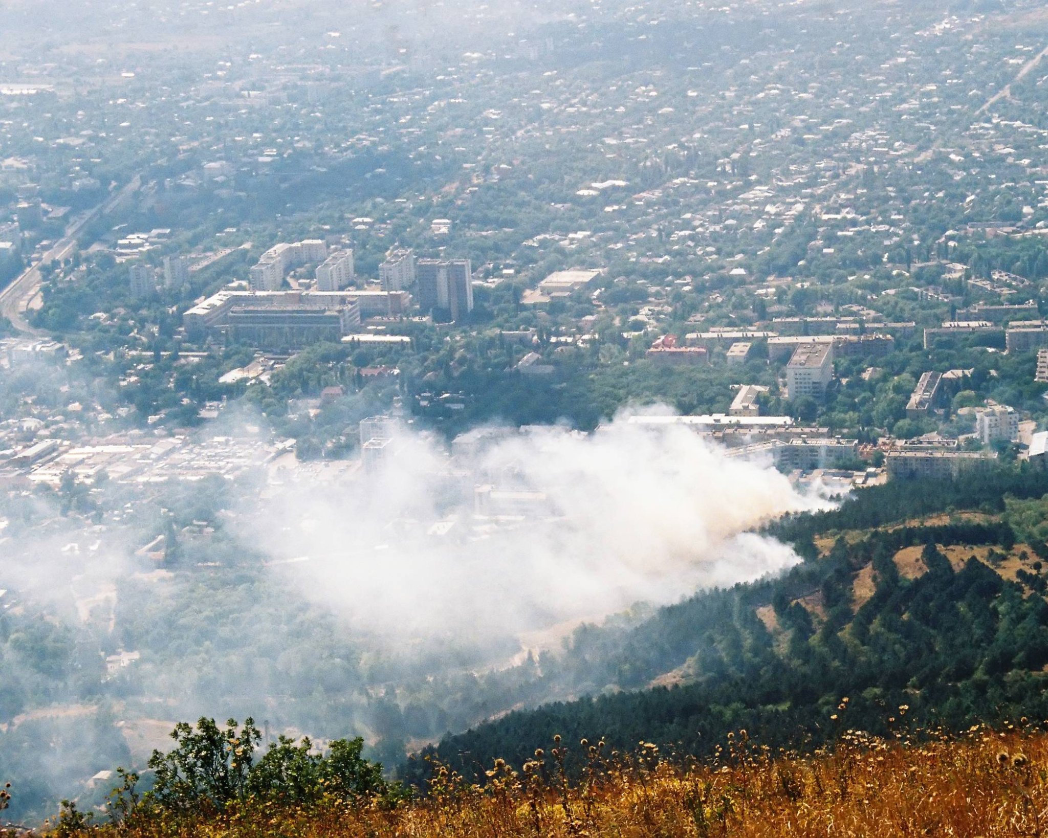 Wildfire smoke contains a combination of gases and particles from vegetation, metals, and other building materials that have all been burnt into teeny tiny, nearly microscopic bits. In addition to the smoke hurting your eyes, the combination of these gases and particles can enter your lungs, causing respiratory symptoms like wheezing and trouble breathing.