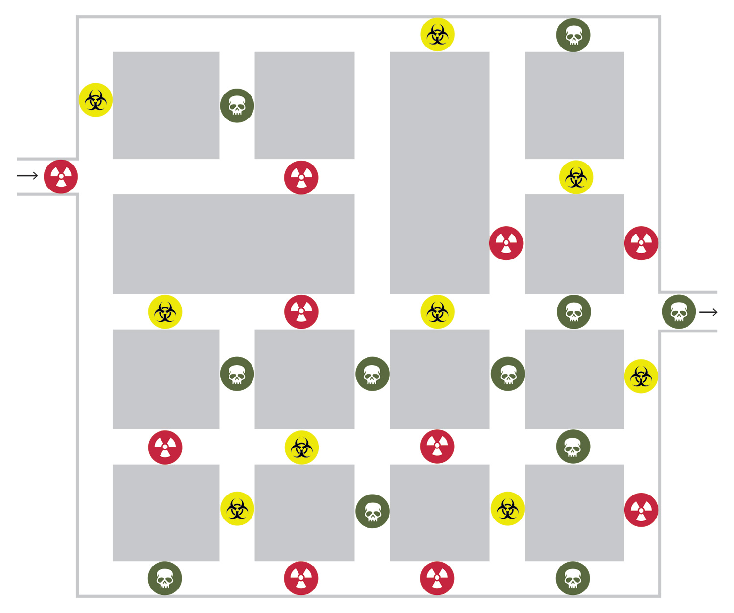 In a typical maze, the entrance leads to the exit. This one is different. Rules determine where and how you can move. You must follow this color order as you meander: red, green, yellow. You can pass through any dot as often as you want, but you must stay within the color pattern, and you can’t double back through the same dot twice in a row.